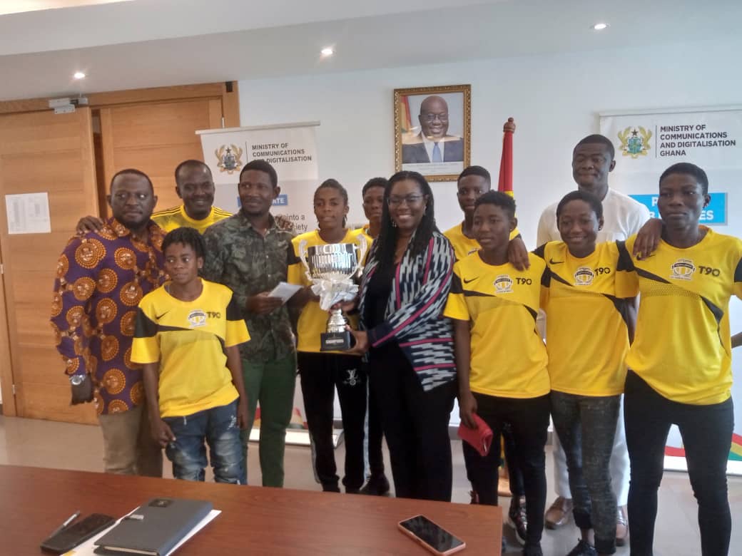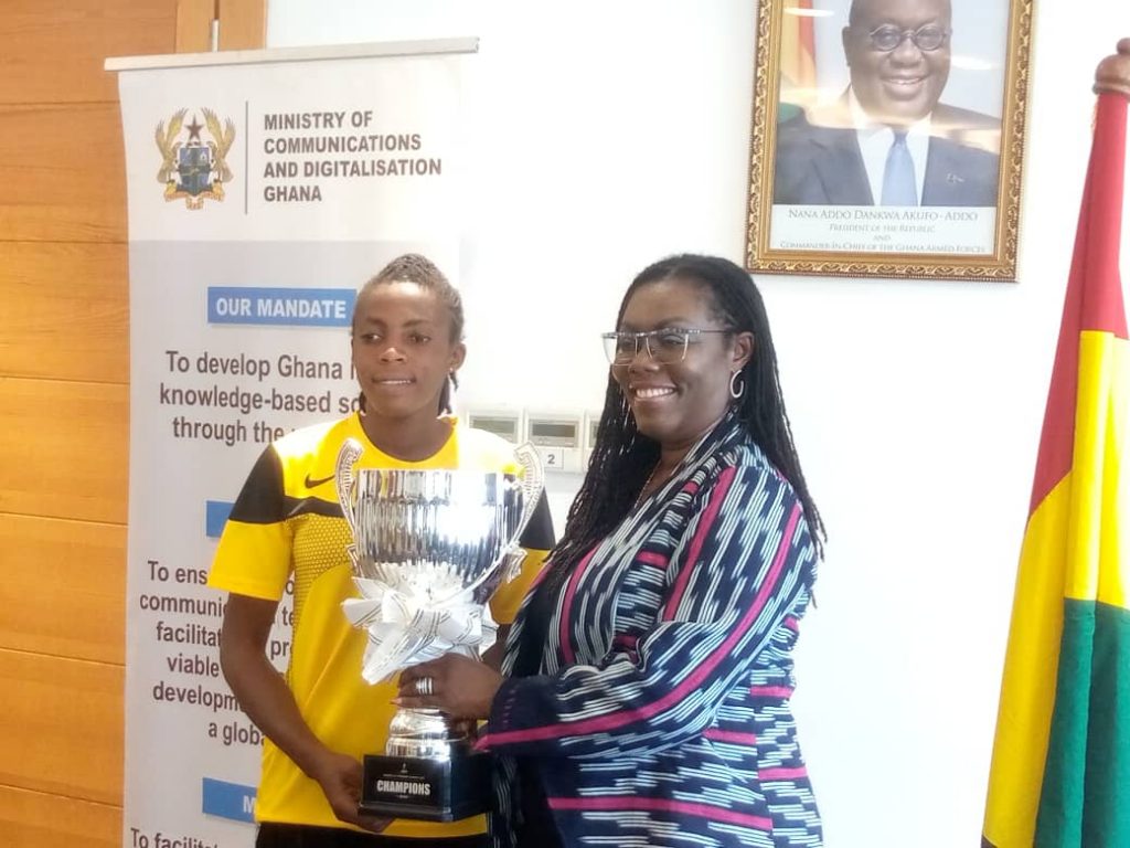 Dansoman-based women’s football club, Faith Ladies, on Friday, November 3, 2022, presented the 2022 Women’s Premier Super Cup they recently won by beating Ampem Darkoa Ladies to the Minister of Communications and Digitalization, Mrs Ursula Owusu Ekuful at her office in Accra.
